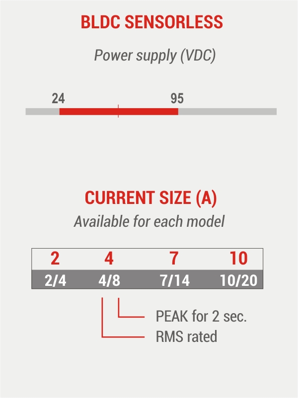 Servo drive for brushless motors without hall sensors up to 1kW (3.3Nm), power supply up to 95Vdc, currents up to 10 / 20A