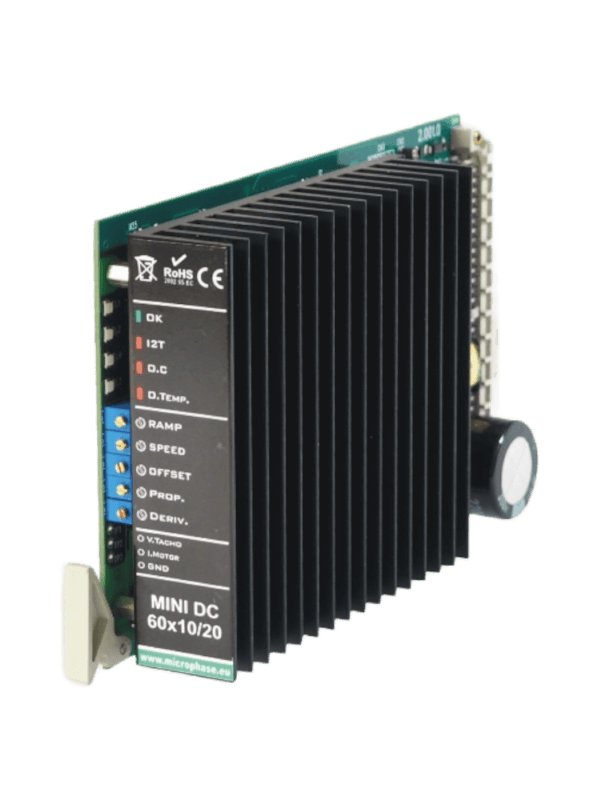 DCD60© is a four-quadrant drive suitable for driving DC servomotors with permanent magnets in Eurocard format. This converter is designed to be inserted on a support or on a rack. It is also available a cable guide with terminal board for applications with single DC power supply.