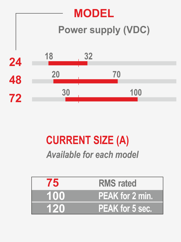 These servo drives are particularly suitable for battery applications with 24/48/72VDC voltage. We implemented a new advanced algorithm for the optimal operation of the brushless motor even without feedback (sensorless). It is complete with internal braking module, the braking resistor must be connected externally. Typical applications: automotive and all automatic machines. High product reliability. Currents up to 75A nominal, 120A peak.