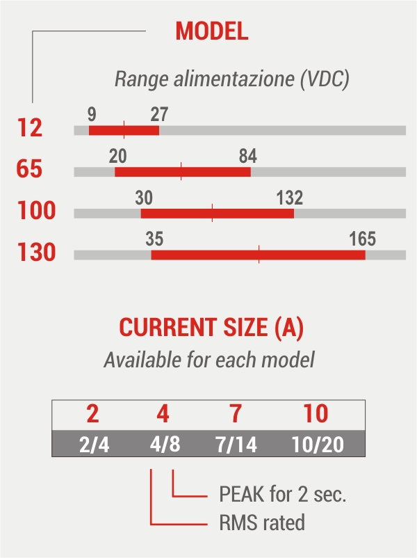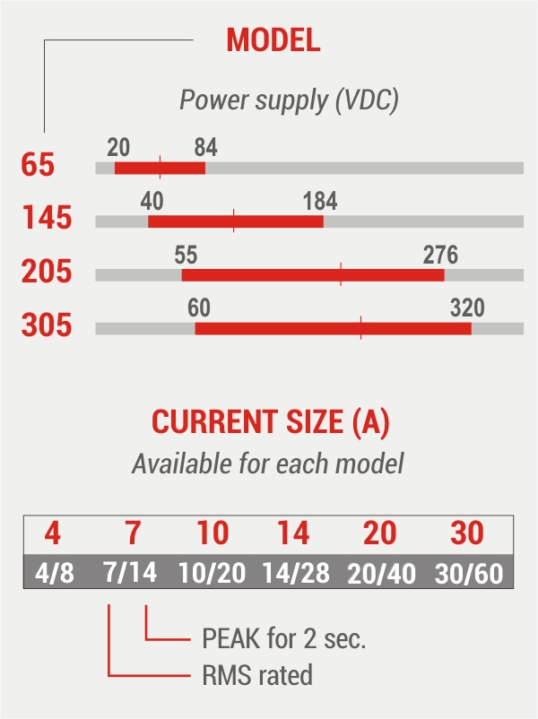 Power supply from 20 to 130 Vdc. Currents up to 10A rated / 20A peak.