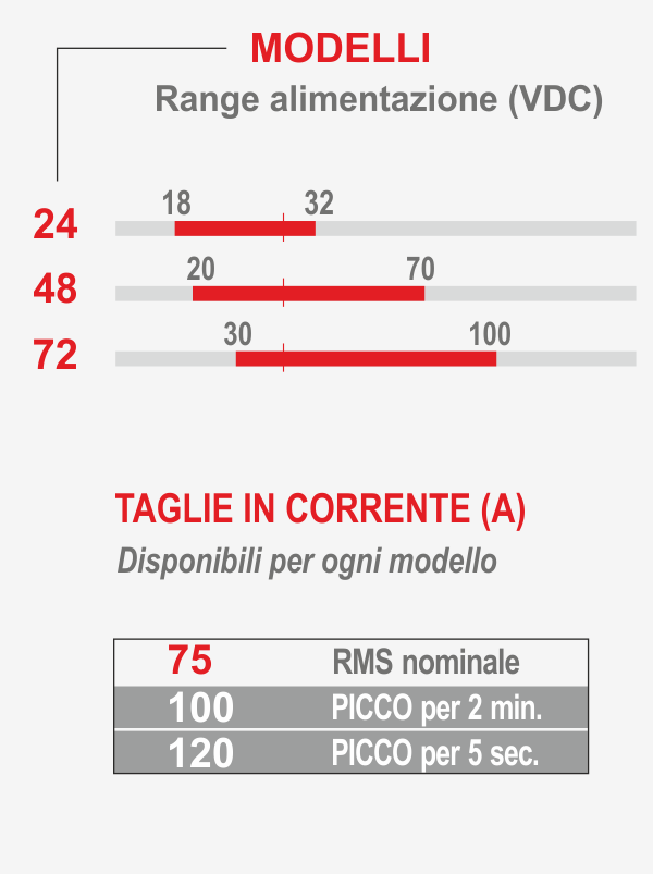 Questi servoazionamenti sono particolarmente indicati per applicazioni da batteria con tensione 24/48/72VDC. E’ stato implementato un nuovo algoritmo avanzato per un’ottimale funzionamento del motore brushless anche senza feedback (sensorless). Applicazione tipica automotive e tutti i carrelli automatici. Alta affidabilità del prodotto. Corrente nominale 75A, corrente di picco per 5sec 120A, corrente di picco per 2 min. 100A. E completo di modulo di frenatura interno, la resistenza di frenatura va collegata esternamente.