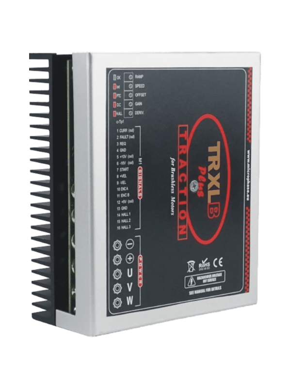 TRACTION PLUS BLDC © è adatto al funzionamento per applicazioni da batteria con tensione nel range da 12 a 96VDC, in abbinamento a motori Brushless trazione. Prodotti affidabili, robusti e di costo contenuto.